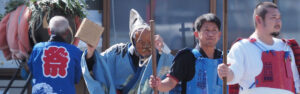 The Tassha Onidaiko is made up of an okina (character wearing a noh mask that depicts an old man) called a mamemaki-gata, a guard with a naginata spear, another with a pole, a taiko drum played by two people on the front and back, and two lions, male and female. The unique practice of the onidaiko of this hamlet is the two warriors holding a spear and pole who face each other and perform martial arts. The okina makes a bean-scattering motion (mamemaki) using just a small wooden box. At the end of the dance, the taiko rhythm changes, the okina pushes the back of the warrior holding the pole, and the two warriors swinging their pole and spear cut through a sacred rope and move forward.